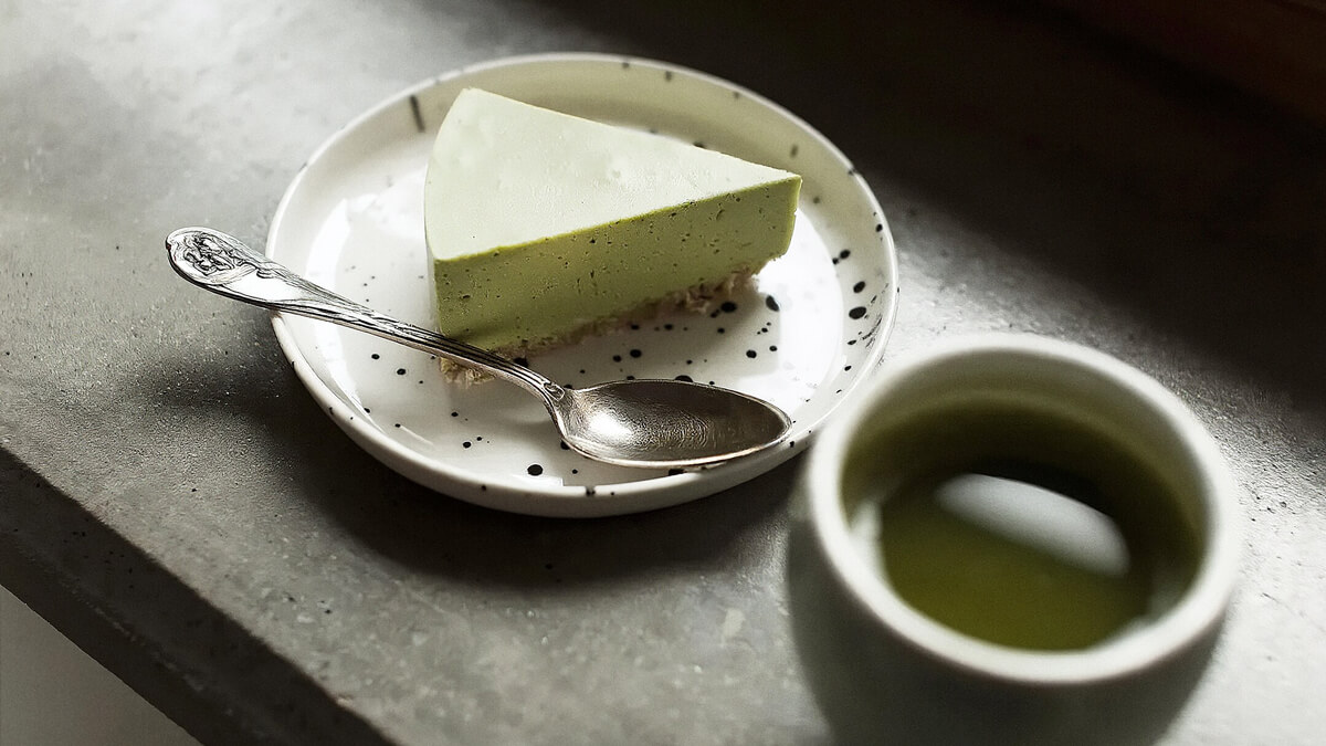 Matcha Sajttorta szelet tányéron, mellette egy csésze zöld tea természetes fényben.